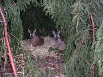 | hier macht sich ein Rehkitz zum Ablegen hinter einen Altholzstapel fertig. | Ablageplatz hinter Tannenbäume |